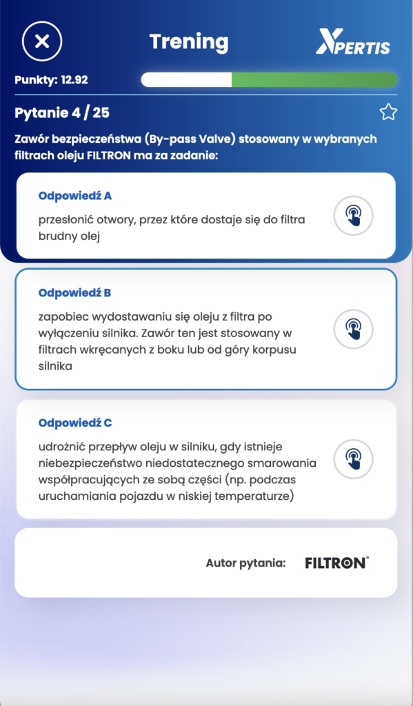 Treningi Wiedzy stanowią ważny element aplikacji Xpertis, umożliwiając użytkownikom aktywne doskonalenie swojej wiedzy branżowej. Punkty i pytania o różnej trudności dodają element rywalizacji i motywują użytkowników do regularnego korzystania z aplikacji w celu podnoszenia swojego poziomu wiedzy.