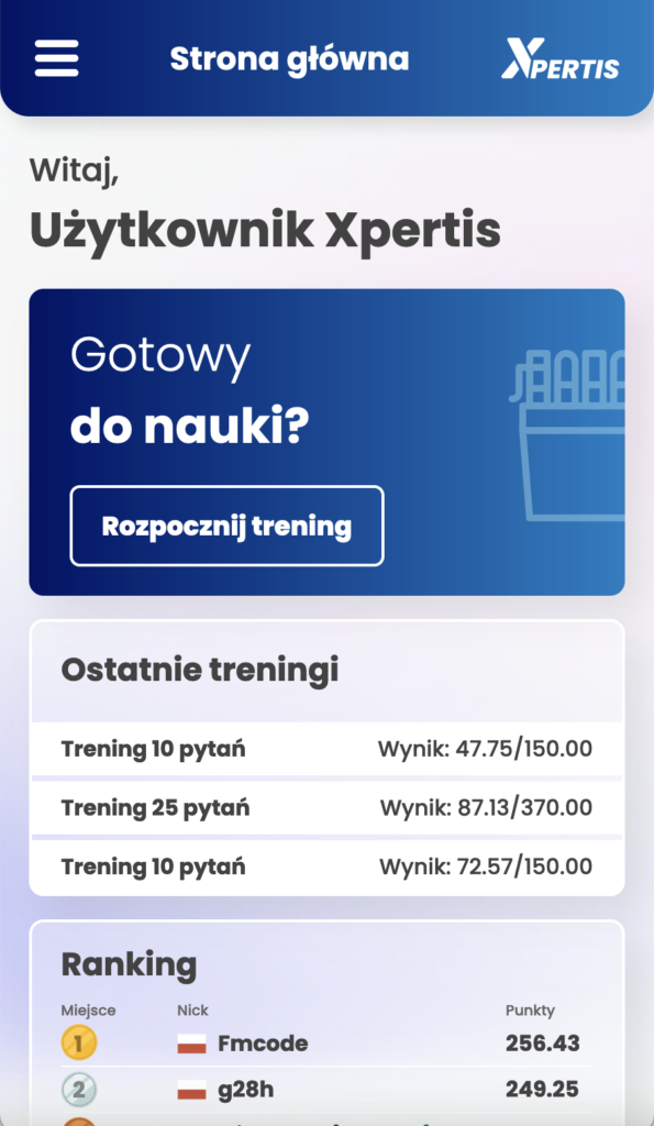 Treningi Wiedzy w aplikacji Xpertis to główna funkcja, która umożliwia użytkownikom udział w quizach z pytaniami branżowymi i testowanie swojej wiedzy.