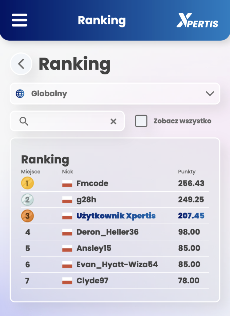 Ranking w aplikacji Xpertis to miejsce, gdzie użytkownicy mogą śledzić swoją pozycję w porównaniu do pozostałych graczy.